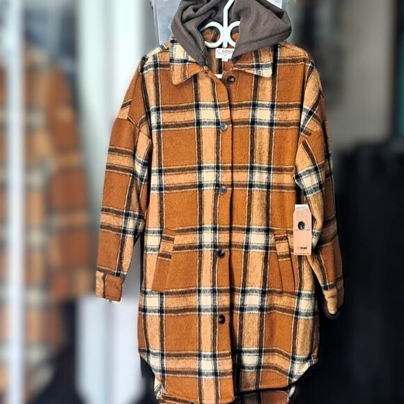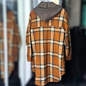 This new Plaid Hooded Knee-length Shacket, which is a shirt-jacket hybrid, from the brand Ci Sono. It is in brown, khaki/tan, black, and off-white plaid pattern with brown solid-colored hood. It has front patch side pockets. It features a soft, brushed exterior fleece lined for warmth.