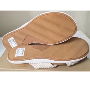 New in box/never worn Clarks Cloudsteppers Eva Shore slide-on thong style casual sandals in manufacturer's colour Natural. Tan & white striped soft textile uppers with cushioned cork-effect footbeds and lightweight flexible TPR synthetic rubber grip outsoles. These are very nice neutral sandals for your summer wardrobe. Size 9