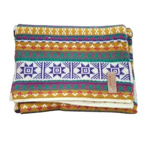 Vibrant scarf with intricate patterns in pink, green, blue, and gold. Perfect for adding a pop of color to any outfit.