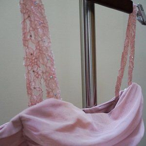Perfect condition satin bodice with sheer chiffon overlay and lace straps with jewels. Can be worn strapless as well. This fits on the small side and would be ok for a size 2-4.
