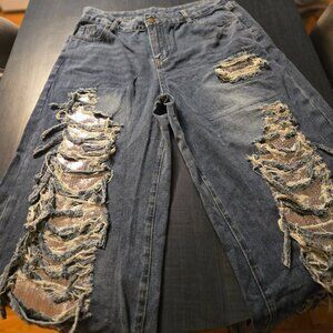 New Cool Distressed Ripped Sequin Wide Leg Jeans size L 30-31