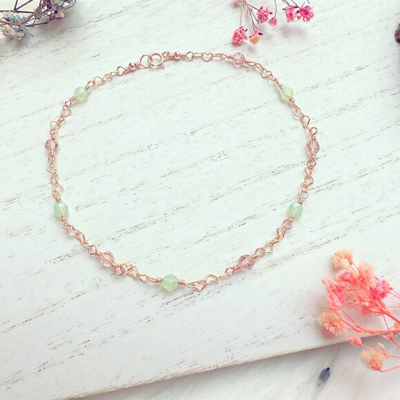 ♥ anklet length is approximately 9.25~9.5 inches with 4mm Swarovski round crystals in chrysolite opal and vintage rose on 14k gold-filled heart chain (individual chain links are 3mm)