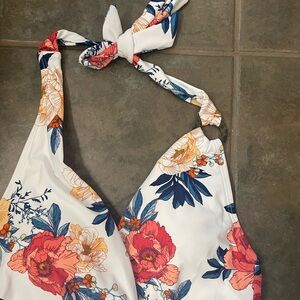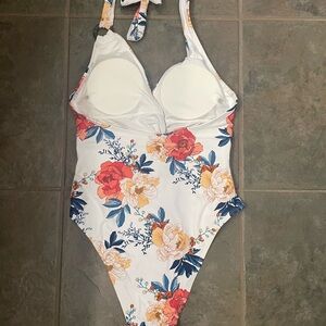 Beautiful white and pink/blue flower pattern halter one piece swimsuit. With a ring detail on the top right.