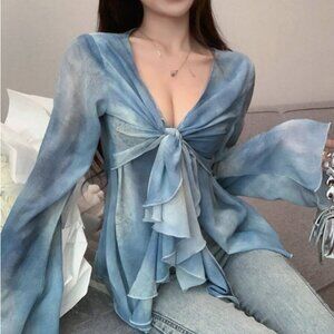 New DAZY Tie Dye Knot Front Ruffle Trim Flounce Sleeve Blouse
