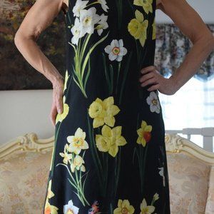 This dress made in black colour with print ( colourful narcissus and butterfly's ).