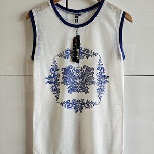 New Danna White Tank Top with Blue Baroque Design