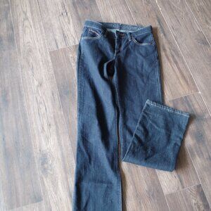 New dark blue Wrangler women jeans .Size 3/4 X 32 long .,made in Mexico they are 80% cotton,13% polyester,1% spandex. They have a Oh- Baby no gap waistband .Mid rise ,bootcut.