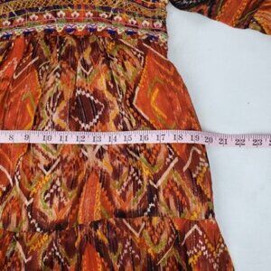 Gorgeous boho maxi dress Shades of orange with a gold metallic thread running through. Beaded line on waist. Ruched back at waist for a little extra stretch. Pull over style. V neck and 3/4 loose sleeves, Lined