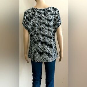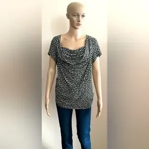 Black Draped Cowl Neck Top with White & Tan Dot Pattern
