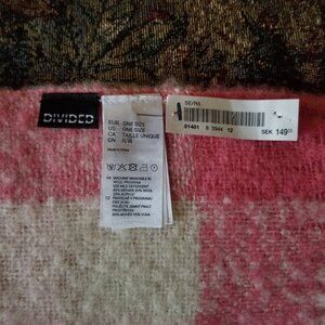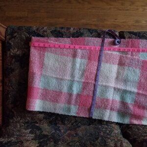 New Divided H&M, long check/plaid scarf, soft not itchy, mohair, wool and acrylic, pink, blue, white large check with ~3 inch fringe, NWT, Reg $150+tax. Material: 40% mohair, 35% wool, 25% acrylic. Size, measurements in inches: length 67, plus 3.5 x 2 fringe = 73, wide 16.5. Machine wash wool or hand wash, air/drip dry or dry clean.