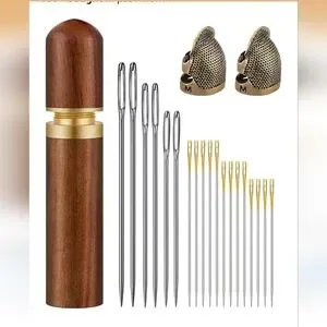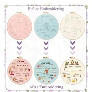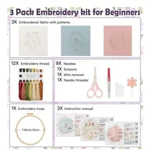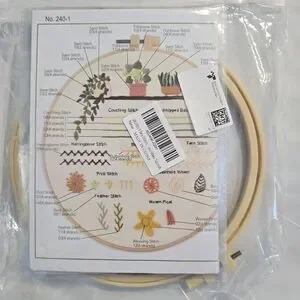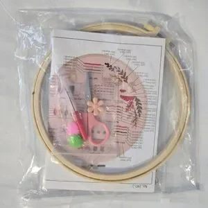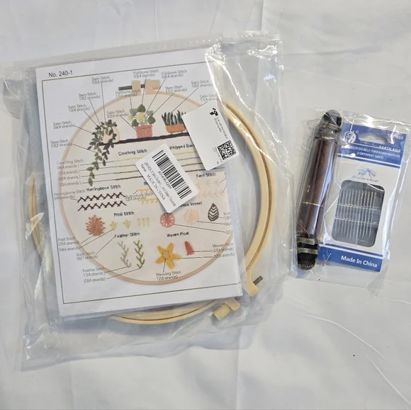 New in package bundle of embroidery supplies. Complete embroidery kit with wooden hoop, thread, templates and tools. Extra embroidery needles and thimbles.