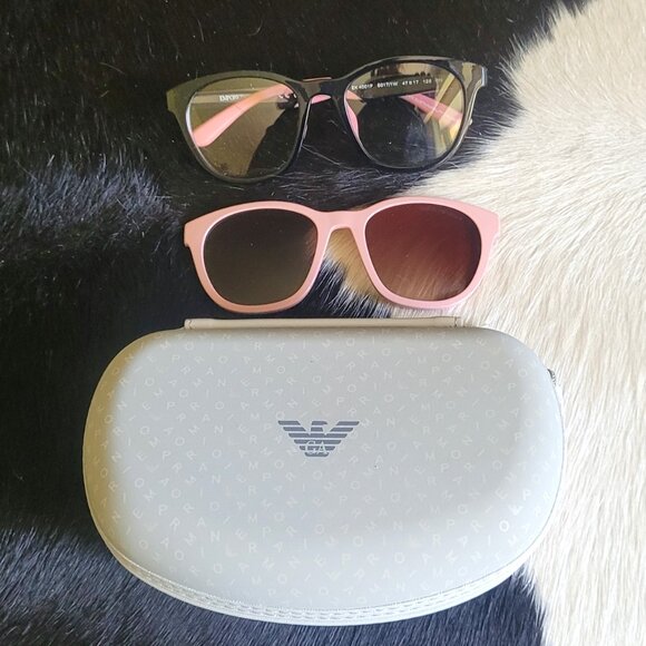 New Emporio Armani kids glasses with magnetic clip on sunglass lenses. Smoke free/pet friendly home. Please note the glasses are black with pink accents and pink sunglasses. Stock photos appear salmon/orange, but they are pink!