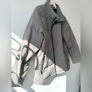 A down filled men’s jacket that doesn’t feel puffy. Grey with black details, 2 way zip, 2 front pockets and hidden inside pocket with zipper, elastic pulls at waist.