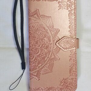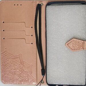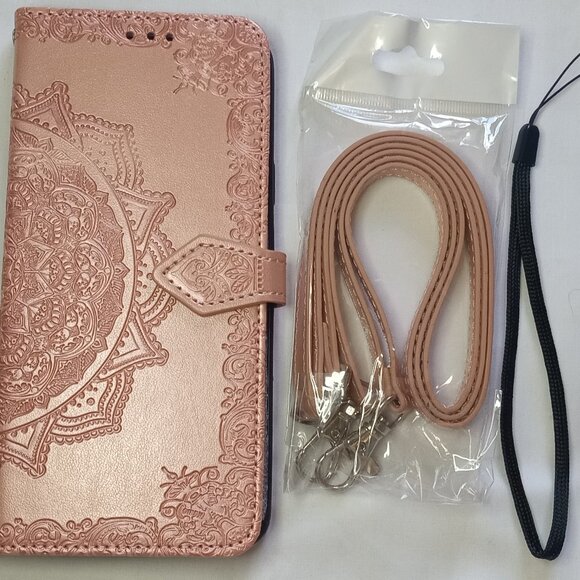 The luxurious faux leather phone case in rose gold is designed specifically for Samsung Galaxy S9 and S9+. With convenient card slots and a magnetic closure, it provides both style and functionality. The package includes a cellphone case, wrist strap, and a cross body lanyard for added versatility. Perfect for those looking to add a touch of elegance to their phone accessories collection.