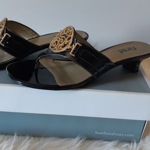 Black and gold cute summer sandal with little heels. Worn once. Perfect condition.