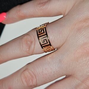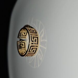 This elegant adjustable gold tone ring features a striking geometric design, perfect for adding a touch of sophistication to any outfit.