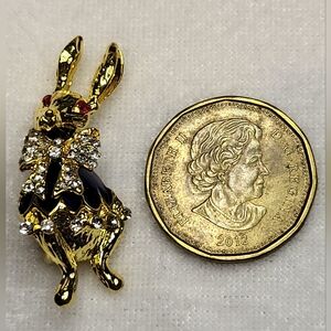 Design: A gold-toned bunny wearing a blue enamel jacket with a large rhinestone-accented bow.