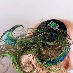 This new with tags fabulous fascinator made and designed by Chantilly Lace Designs is made with a rich dark green velvet, and then topped with various long peacock feathers. The perfect finishing touch is an art deco inspired emerald crystal surrounded in hematite like crystals. This fascinator will leave everyone breathless, so fun but so elegant.
