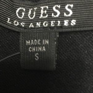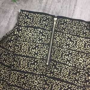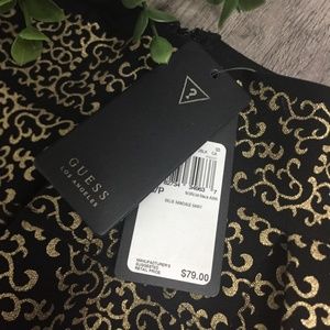 Guess pleated A line mini skirt New with tags $79.99 plus tax Size small Zip up back with hook closure at top Lots of stretch to type of material Very striking black and metallic gold print 75% polyester 25% pvc Laying flat the waist measures approximately 13 inches across