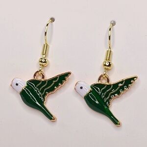 New hand crafted, super cute novelty fun green parakeet in flight bird enamel dangle French hook earrings. Hook is made of brass coated with 14K gold. Makes a great gift or stocking stuffer!