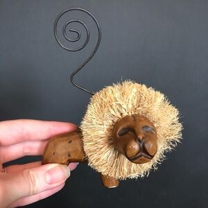 NEW WITHOUT TAGS Set of 3 wooden safari animals picture frame sculptures that have been handcarved. They each hold a picture on the top of them where the swirled metal is. Such a great character to each rustic piece and are very light weight. The set includes one lion, one giraffe and one zebra. They are brown and tan and cream colors. Their manes are made out of a hay like texture. In excellent brand new shape with no flaws as they are new (they are perfectly imperfect since they are hand carved). Please see photos for details.