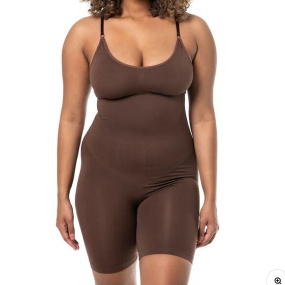 This chocolate brown shapewear offers a sleek and comfortable fit, featuring thin adjustable shoulder straps for a personalized fit. Provides a smooth silhouette under any outfit. 85% polyamide 15% elastane