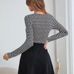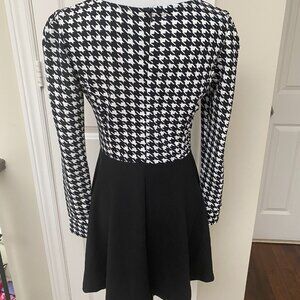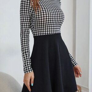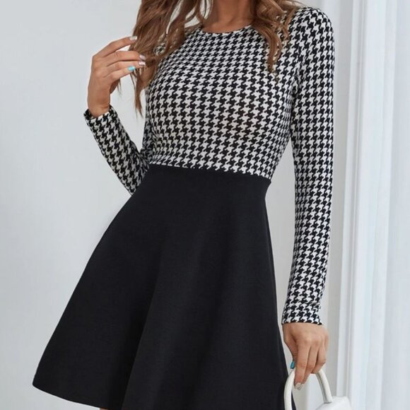 New Houndstooth Fitted And Flare Long sleeves mini Dress