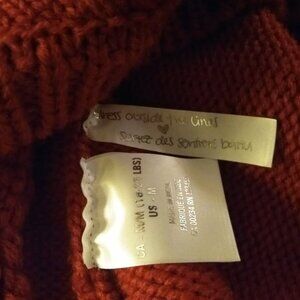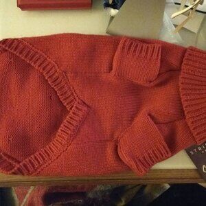 Red is bright, not like on my pictures. Very festive. Gorgeous, perfect for a gift, sold out everywhere. Red with colourful pompoms. Size M, for 18-25 lbs. 100% acrylic. Have two available.