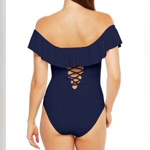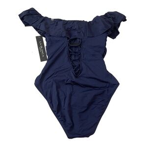 New La Blanca Navy Off Shoulder Ruffled One Piece Swimsuit US 4
