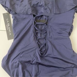 NEW La Blanca Navy Off Shoulder Ruffled One Piece Swimsuit US 4