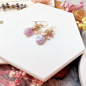 ♥ delicate and cute multi gemstone 14k gold-filled earrings with lepidolite drop puff (8x12x4mm), mini rainbow moonstone faceted rondelle (2x3mm), mini tanzanite faceted rondelle (3x2.5mm), mini faceted pink opal (3mm), mini faceted multi-color moonstone (3mm), mini faceted pink tourmaline (2.80mm)