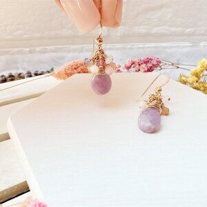 ♥ delicate and cute multi gemstone 14k gold-filled earrings with lepidolite drop puff (8x12x4mm), mini rainbow moonstone faceted rondelle (2x3mm), mini tanzanite faceted rondelle (3x2.5mm), mini faceted pink opal (3mm), mini faceted multi-color moonstone (3mm), mini faceted pink tourmaline (2.80mm)