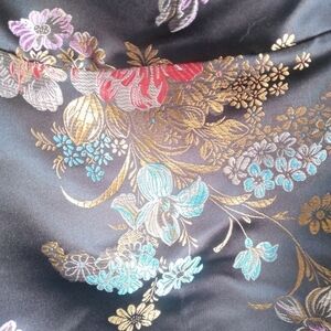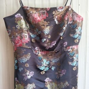 Excellent condition, Black mini dress with metallic floral design. Square neckline, adjustable straps and invisible zipper.