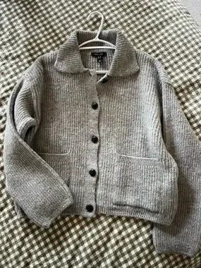 Ribbed knit button-up cardigan with a soft collar. Simple single-button front. Subtle textured finish for everyday wear. Brand new, never worn! Really cozy.