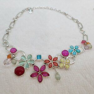 Vintage Caracol (Italian) necklace, bracelet and earring set in stunning bold rainbow colours. Statement Set. Silver toned chain. Bracelet stretches. Necklace is 19 inches adjustable. Earrings are 2.5 inches drop.