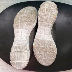 Sketchers Minor league sneakers in a metallic gunmetal colour. Size 8 Us/Canada. All day comfort and great breathabilty, foam insoles. Only worn once excellent condition only discoloration of bottom of soles. Very comfortable and attractive sneakers. Has box but it lacks top.