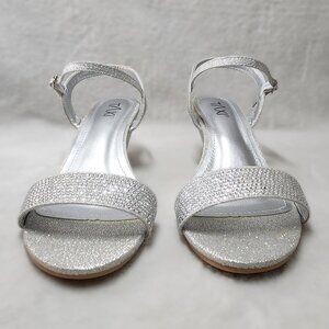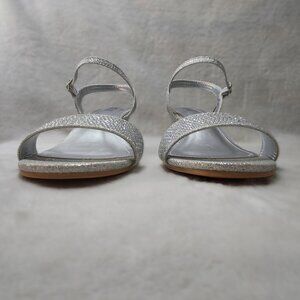 Wedge open toe sandals by Taxi in a glitter silver colour with an opalescent silver rainbow colour glitter. Never worn excellent condition. Company glue has not aged well and can be seen to patina ever so slightly at edges, easy fix, or can simply add a bead border. Lovely nevertheless! Party Sandals. Original box included. Size 7B. Has extra heels included.
