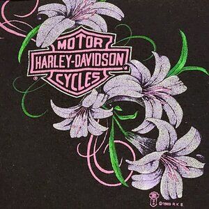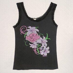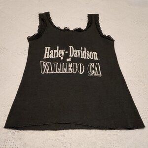 *Very Rare* 1990 Vintage Harley Davidson Cycles Tank top with Lily flowers on the front and Vallejo Ca. Shop featured on reverse. Tank features lace edges on top. Size unknown but fits like XS to Small/however has a lot of stretch to it. Pit to pit 12.5 inches without stretching. Some reasonable wear(visited a few runs)... but overall great preloved condition! This is a very special piece.