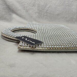 Ruri Beaded silver evening bag by Nina. 26 cm wide and 26 cm top of handle to bottom of bag. Excellent unused condition. Front beads and back silver glitter.