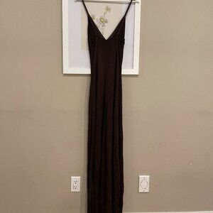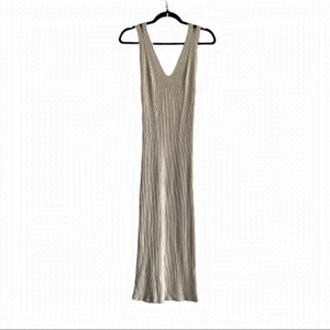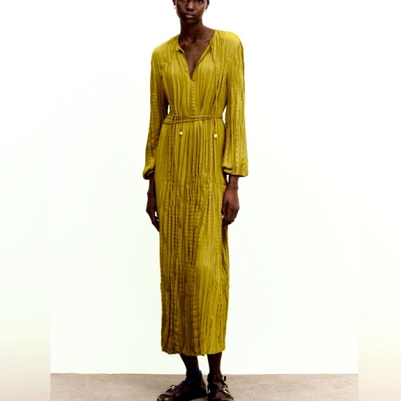 Massimo Dutti Plisse maxi dress in olive yellow-green. Crease pleats allover, rounded neck has a draw cord with white porcelain drop beads. Comes with a string belt if you want to tie it at the waist.