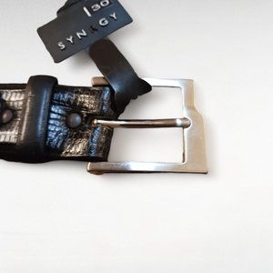 NWT New Men's SNRGY Black Leather Reptile Embossed Brushed Silver Buckle 30" Belt