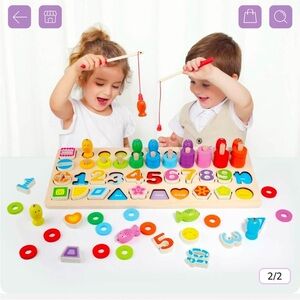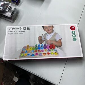 The board has four options for play. One is to match the numbers to the holes, the second is to match the letters, the third is to match the circles to the protruding sticks and the fourth is to match the shapes to the corresponding indentation on the board. The pictures and background depict the sea and sea animals, the lettering in English will teach counting from 1 to 10, and each letter indent background has a funny face. This will add more fun to the play!