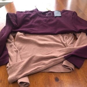 Two tops Burgundy size small Move long sleeve top with tags and a pinkish exsmall Dynamite long sleeve top. Both tops will work well with shorts, jeans, and skirts. Please note these are crop tops and not full length