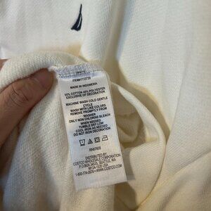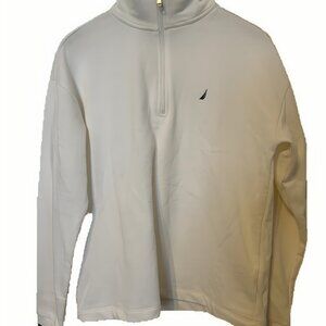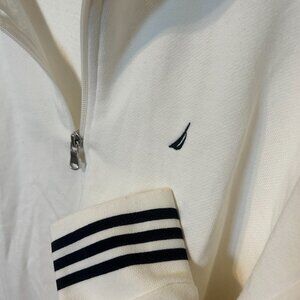 This Nautica women's sweatshirt features a classic 1/4 zip pull-over closure and is made from a comfortable cotton blend material. The white sweatshirt is accented with blue stripes and the Nautica logo, giving it a nautical and boating aesthetic. Perfect for travel, parties, or casual wear, this sweatshirt has a regular fit and is available in size S.
