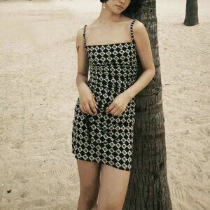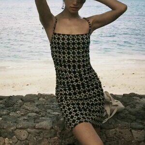 Brand New Nanushka monogram pattern ruched dress in size XS. This stylish mini dress features a flattering ruched design and is crafted in a classic black colour. Perfect for any occasion, this dress is a must-have addition to any fashion-forward woman's wardrobe.