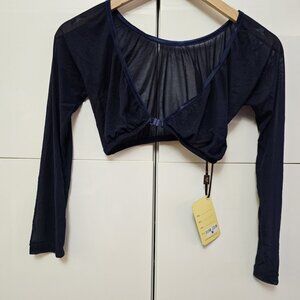 It has the option of being worn with the low-cut side in front, or reversed with the higher side in front to provide cleavage cover if so desired. This classic style in navy adds a touch of sophistication while transforming your outfit and your arms!