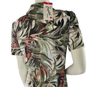 Half sleeve, button front women's shirt. Size: medium. New, never worn. 100% Polyester. Crystal Fashions.