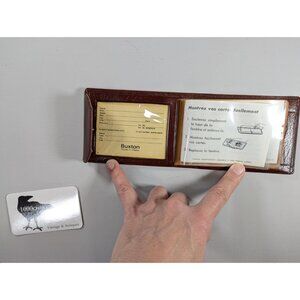 A vintage New Old Stock brown leather wallet by Lord Buxton, made in Canada from Aniline Calf leather. The item is brand new and not even folded and comes with the sample cards and guarantee slips when it was bought. It has space for paper money at the back with a separator down the middle. To the left, plastic sleeves in a leather push-button closing slip your ID, drivers licence or bank cards. This whole section can be taken off the wallet if wished. There is a window with owners ID information that will stay on the wallet. To the right, some space for a spare key, stamps or a folded note (like a grocery list)
