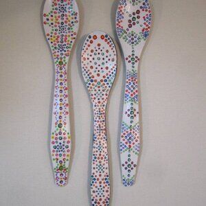 Each spoon measures 7.25″H x 1.25″W, Aspen Wood, Acrylic paint w/ acrylic high gloss glaze.