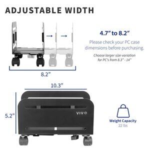 "Mobile adjustable PC stand (CART-PC01) from VIVO. Increase the ease of mobility of your computer with this solidly constructed PC cart which features four caster wheels for easy access (two are lockable to keep the cart stationary when desired). Along with its high grade steel material able to hold up to 22 pounds, the frame has a powder coated finish and features inside padding to protect your PC from scratches. The cart comes in a matte black finish, maintaining a low profile and blending in well with a majority of environments. Features • Four caster wheels improve accessibility and mobility • Adjustment from 4.7" to 8.2", fitting most ATX cases on the market • Wheel locking on two of the four wheels as well as anti-skid gripping • Inside padding to protect computer from scratches